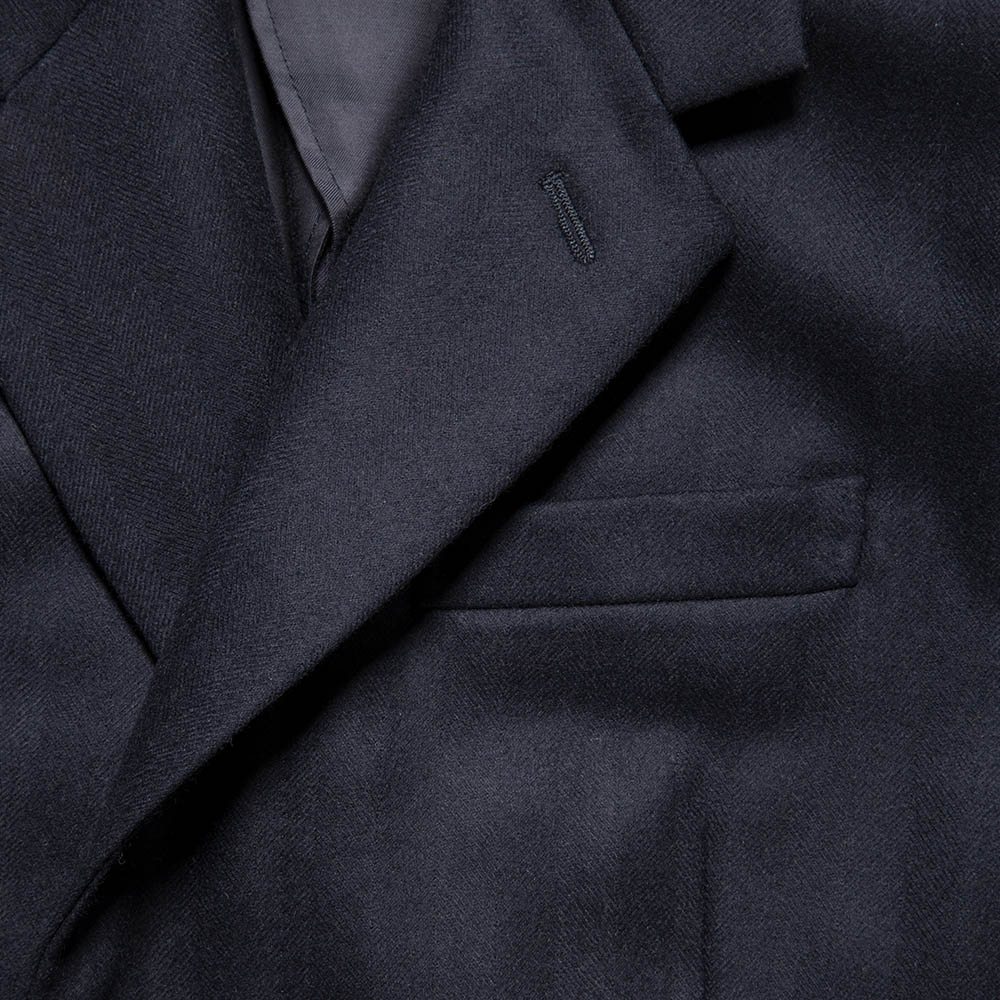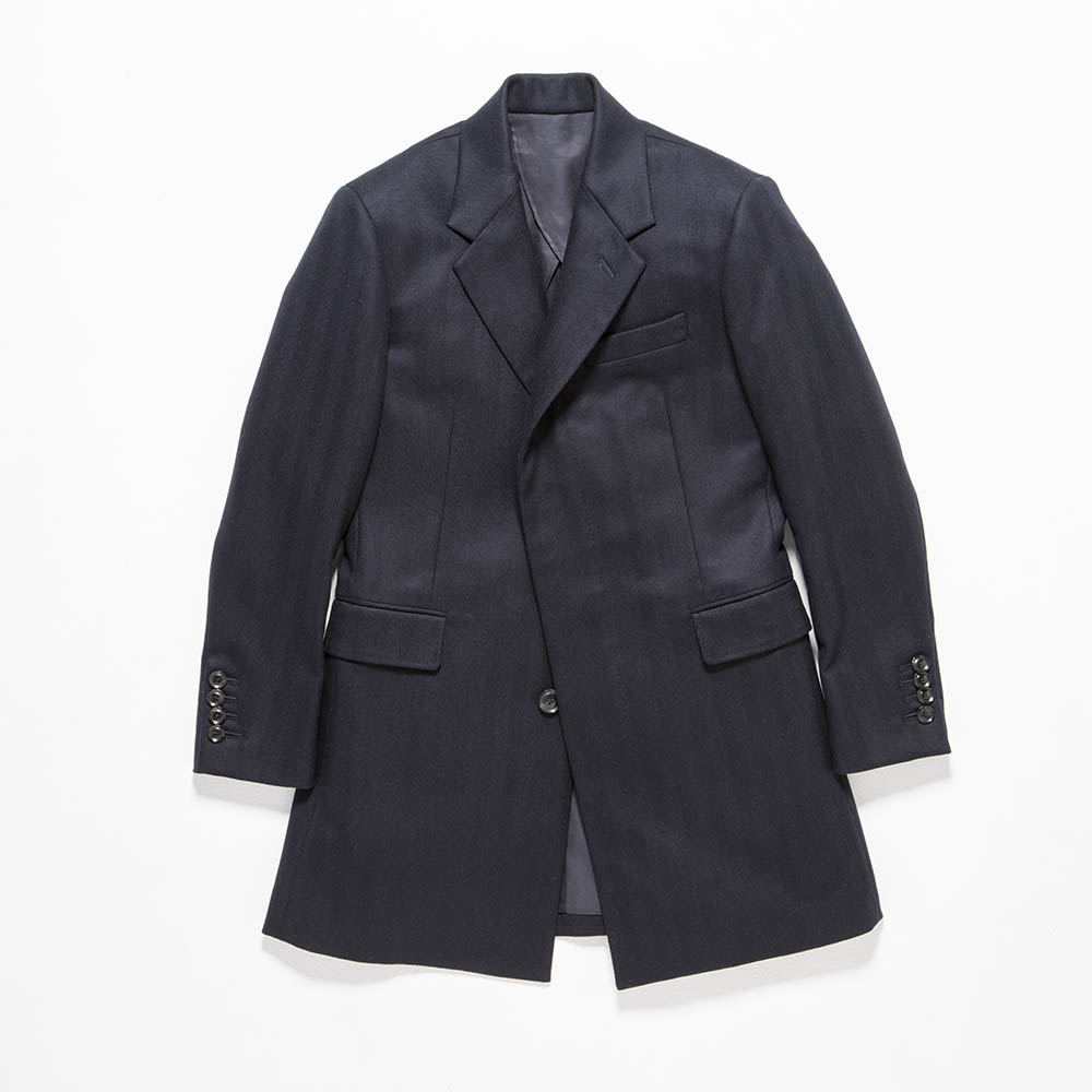 ぱっと見ると、無地かシャドウストライプ。けれど、よく目を凝らしてみると、そうでないことに気付くはずです。この比翼仕立てのチェスターフィールドコートは、濃紺のヘリンボーン柄をしています。素材はウール100%のスーパー140です。