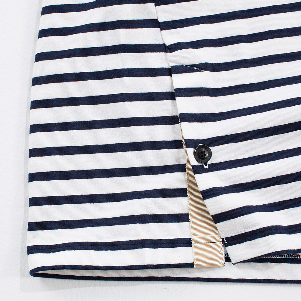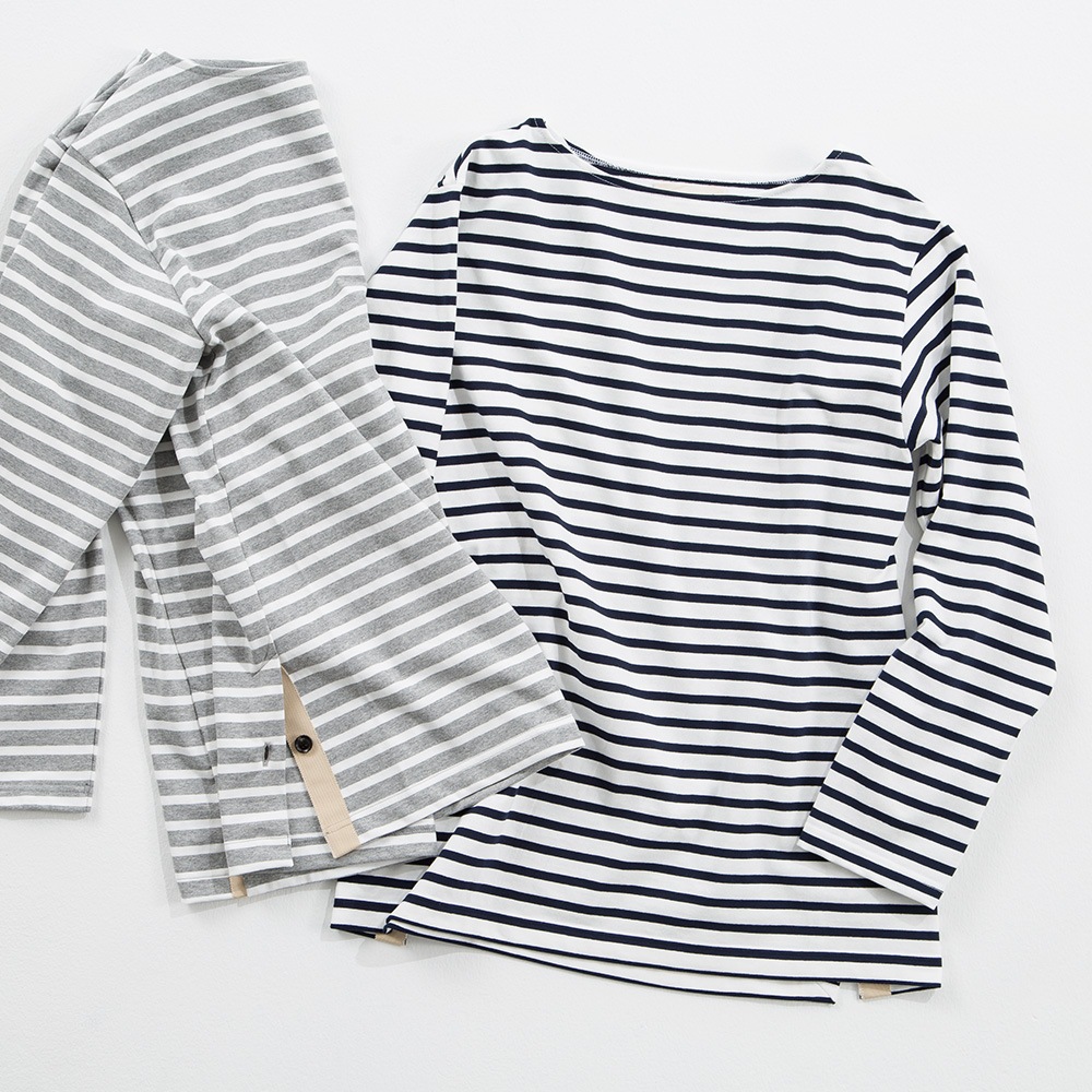 トルコのイズミル地方原産の繊維長が長いエーゲ海コットンをオープンエンド紡績、専門用語では「空紡」と呼ばれる紡績方法でつくった糸が使われています。表面の撚りが強く、中が甘くなっていて、ドライタッチで仕上げられていますが、着るほどにふくらみも増し、体に馴染みます。カットソーは直線的なパターンを採用したものが多いのですが、厚さがあり、伸びにくい生地の特性がありますので、胸にゆとりを持たせ、ウエストをわずかに絞ったパターンでつくり着やすくしました。縫製はcantate のシャツを縫っている工場にお願いしています。サイドのベントを入れ、額縁仕上げに。アイコンであるシルクのグログランテープと本水牛ボタンを付けました。