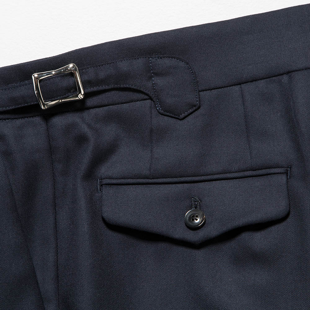 素材は、ウール100%のスーパー140。格上げして織りあげたツイル生地は、ハリと艶、独特のヌメリ感があります。随所に光る、職人の美しい手仕事と、心地のいい着用感を楽しんでください。