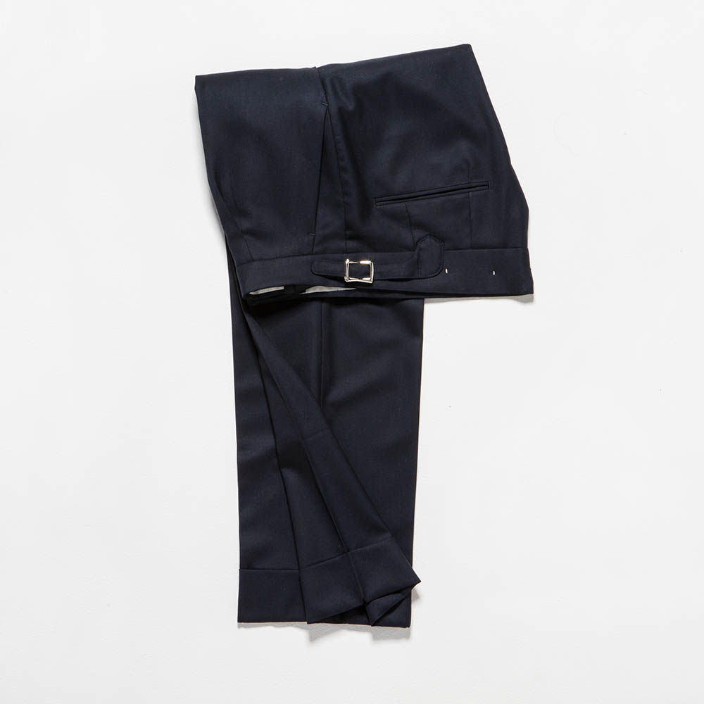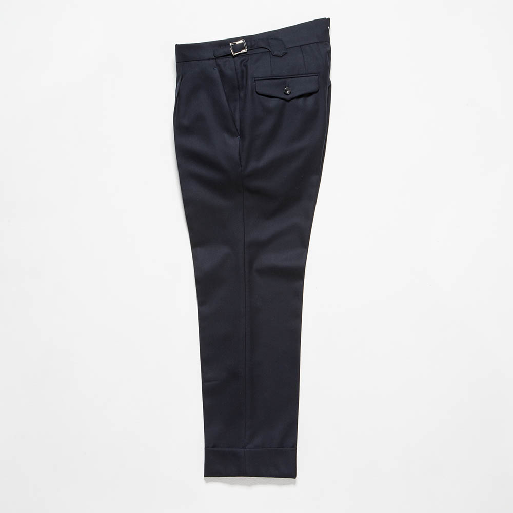 ベルトループは必要ありません。サイズは、ジャストなものを選ぶか、ウエストの両サイドにとりつけた尾錠で調整をする。あるいは、サスペンダーを使う。これが、このパンツのスタイルです。シンプルな腰回りは、スタイリッシュな印象を演出してくれます。