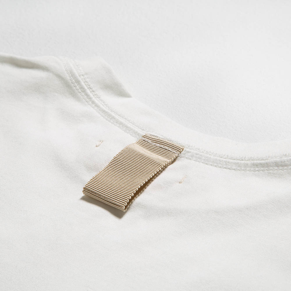 洗濯後の干しやすさも考えて、背面の襟ぐりには、シルクのグログランリボンでハンガーループを付けました。ぜひ、どんどん洗ってください。上質な綿生地は、洗濯をすることによって表面が少し毛羽立っていき、光沢感が生まれてきます。洗うほど柔らかくなり、着心地も良くなります。きっと、毎日でも着たくなるはずです。