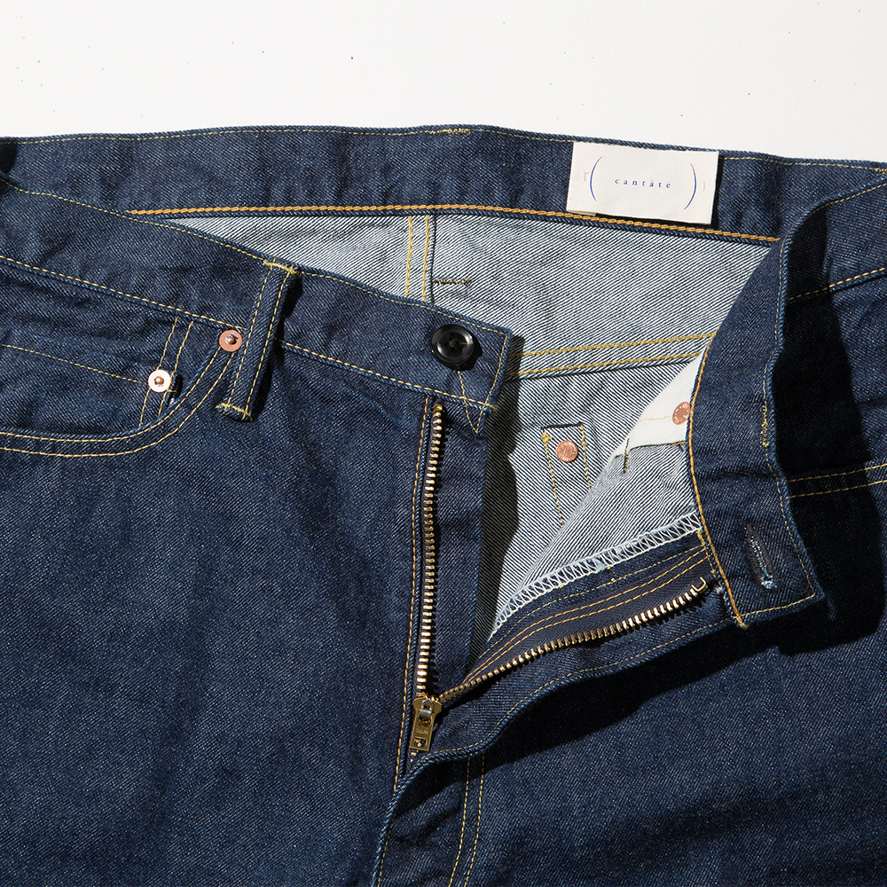 デニム生地はテーパードデニムと同じです。経緯糸7番と同じでありながら、経緯糸の本数にまで拘ってシャトル織機で織り上げています。もちろん生地の端にはピンク色のセルビッチを付けています。