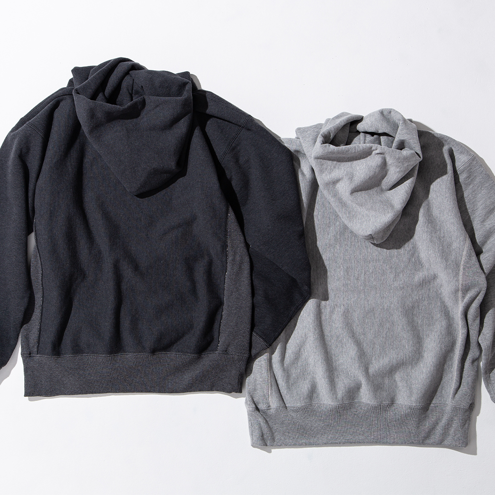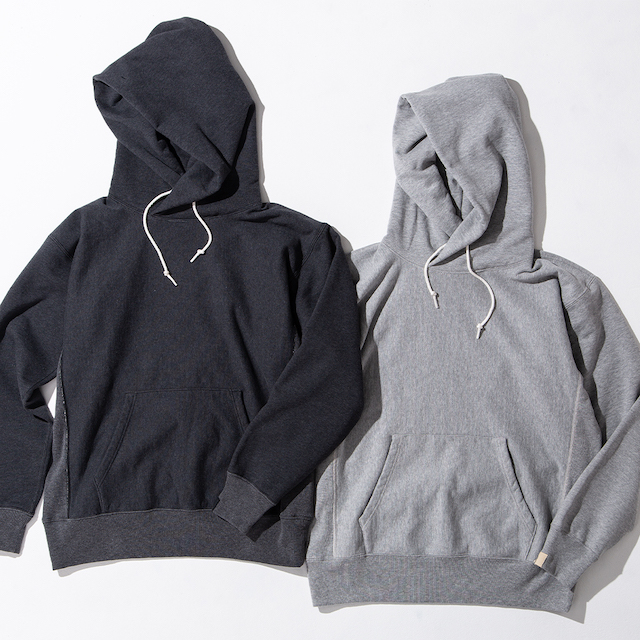 クルーネック同様、吊編み機で編んだ裏毛で、グレーとチャコールグレーの2色展開です。
