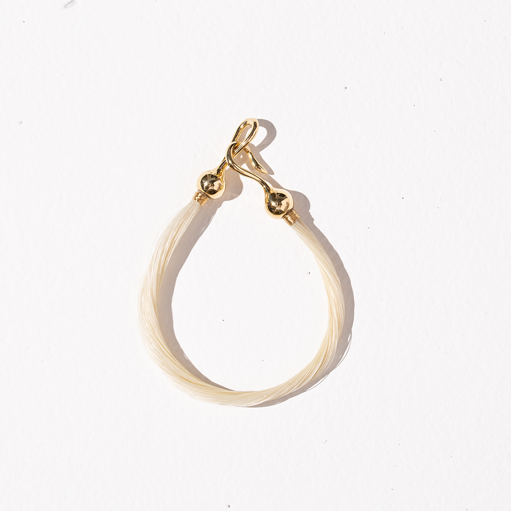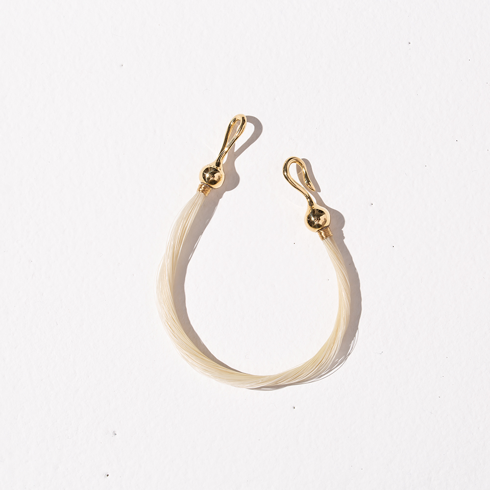 束ねた馬毛で作ったバングル。留め具には、キーリングとマネークリップと同様にラグジュアリーな18金イエローゴールドを採用しています。