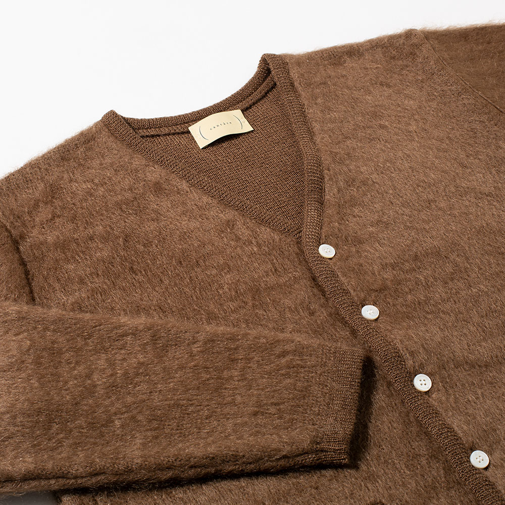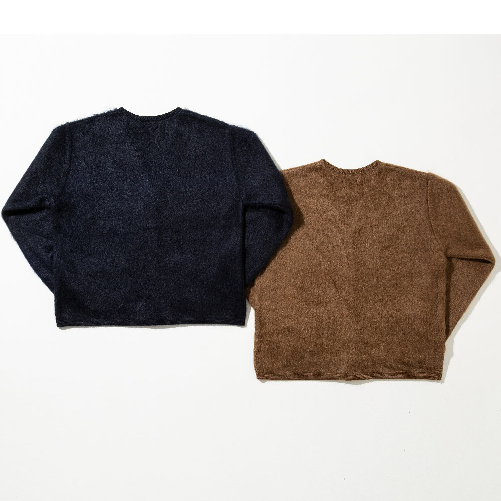 モヘヤのカーディガンといえば、真っ先にニルヴァーナのカート・コバーンが思い浮かぶと思いますが、グランジを代表したアイテムとは対極に位置するラグジュアリーな仕上がり。一般的なモヘヤニットはナイロンを混紡していますが、こちらには一切使っていません。