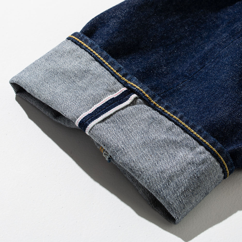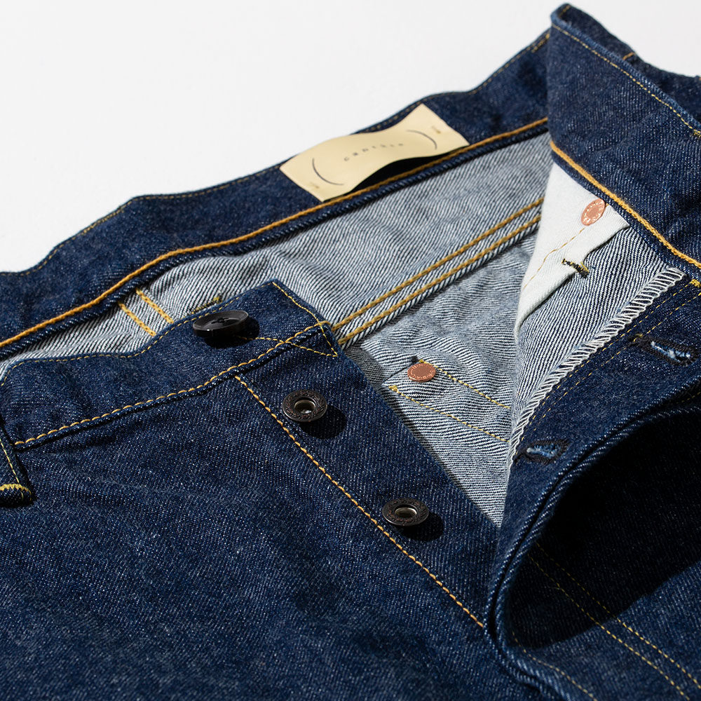 シルエットやディテールは、ヴィンテージジーンズの中でも高い評価を得ているリーバイス®の55年モデルをイメージ。ボタンフライで、ウエストボタンだけ本水牛で高級感を演出、残りは”タックボタン(ネオバーボタン)”を採用しています。